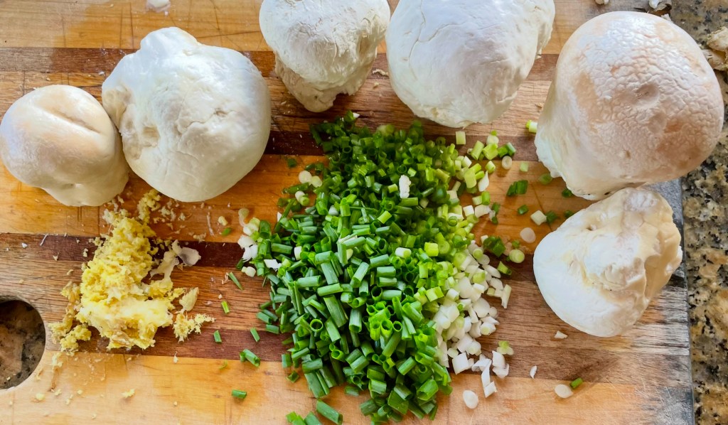 above is our display of mushrooms with chopped onion tops and grated ginger