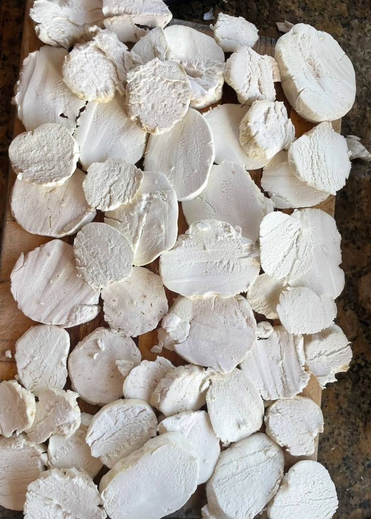 - once mushrooms are acquired, rinse them, remove any damaged bits, and slice thinly. it will look like beautiful mozzarella cheese. don’t eat it raw. I don’t think you’re supposed to do that. ;p