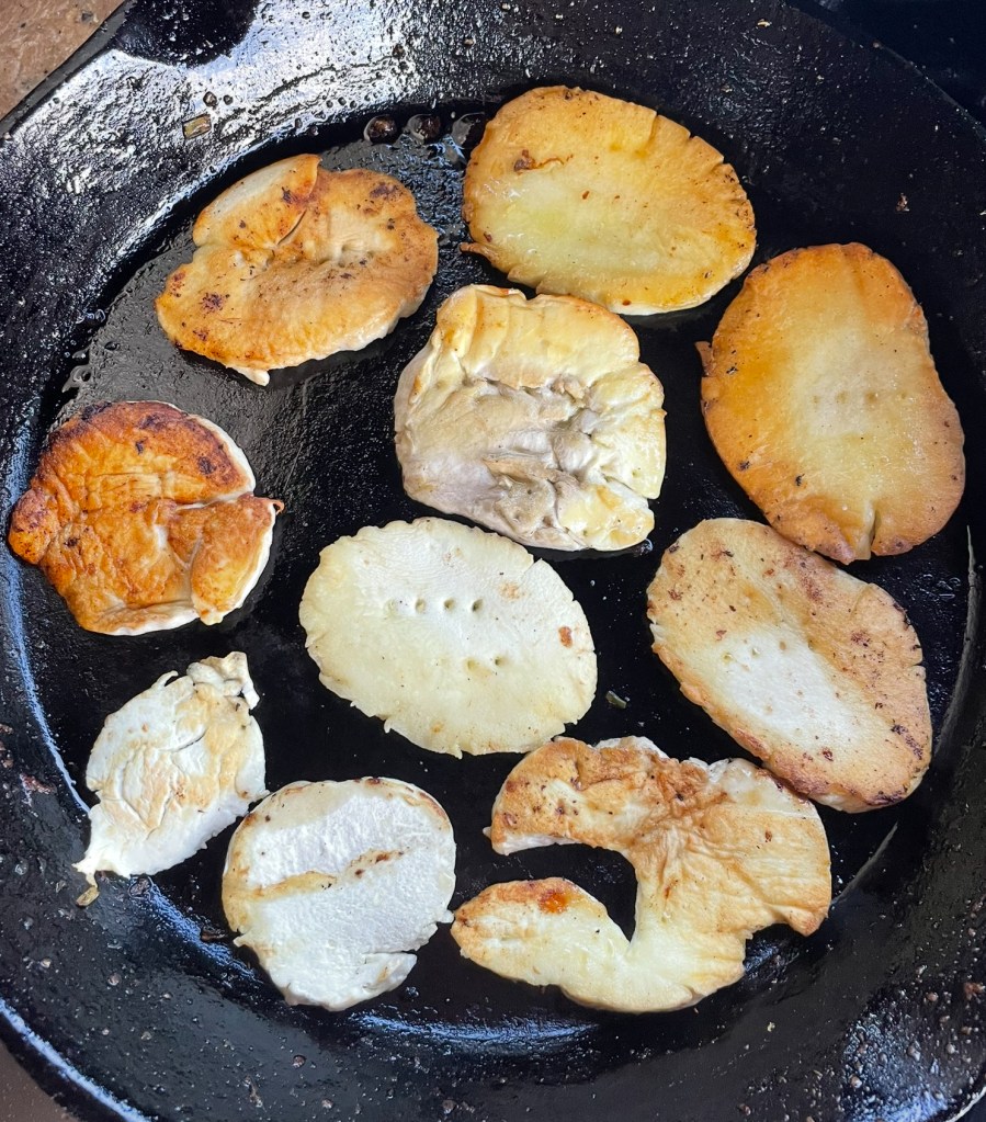 2. heat up your oil in a cast iron pan. once hot, add the mushrooms, layer by layer laying them flat to fry in the oil. watch them like a hawk so they don’t burn. cook them until they are golden brown on each side (u will need to flip each one)